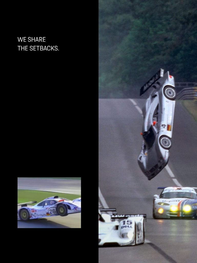 Salah satu slide menampilkan Mercedes-Benz CLR yang dikendarai Mark Webber saat melayang di sesi latihan 24 Hours of Le Mans 1999, insiden yang terjadi akibat masalah aerodinamika. Gambar tersebut dipasangkan dengan Porsche 911 GT1 yang juga terangkat saat balapan Petit Le Mans 1998.