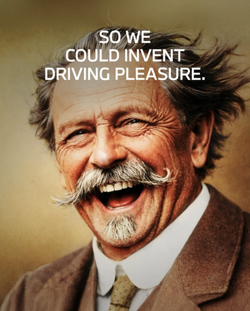 Kejutan muncul di slide kedua. Foto Karl Benz tampak tertawa, disertai kalimat, โSo We Could Invent Driving Pleasure,โ sebuah sindiran halus yang merujuk pada filosofi BMW sebagai produsen mobil dengan sensasi berkendara menyenangkan.
