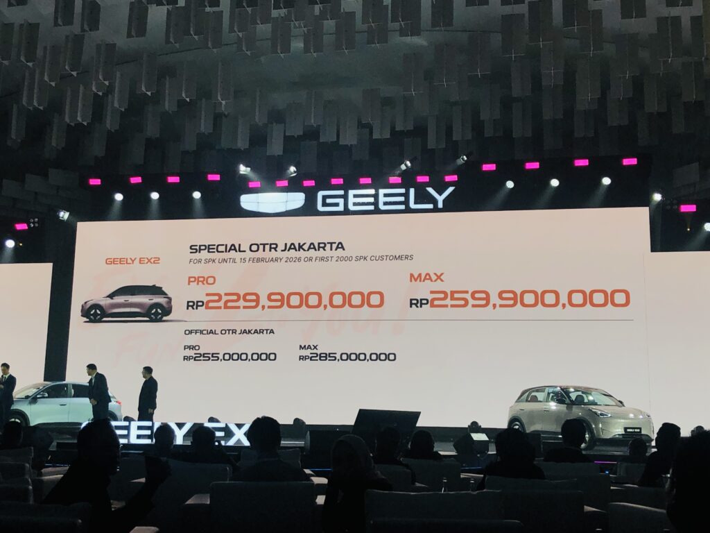 Dalam sesi presentasi, Geely menghadirkan dua skema harga, yakni harga spesial dan harga resmi On The Road (OTR) Jakarta. Untuk periode promosi awal, Geely menawarkan harga Special OTR Jakarta yang berlaku untuk pemesanan hingga 15 Februari 2026 atau terbatas bagi 2.000 konsumen pertama. Pada skema ini, Geely EX2 varian Pro dibanderol Rp229.900.000, sementara varian Max dipasarkan dengan harga Rp259.900.000.